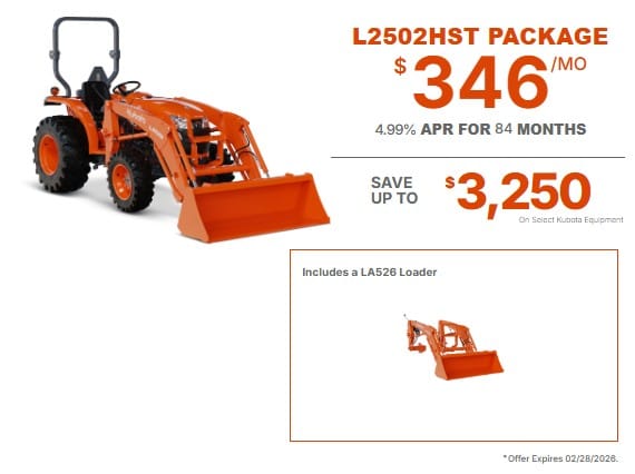 Monthly payment shown is based on no money down with 4.99% APR for 84 months. Insurance is included in the estimate; however, taxes and applicable fees are not included and may vary based on individual circumstances. Financing is subject to approved credit. Offer valid on in-stock units only. Promotion expires 2/28/2026, but is subject to change without notice. For complete details, visit your local dealer or KubotaUSA.