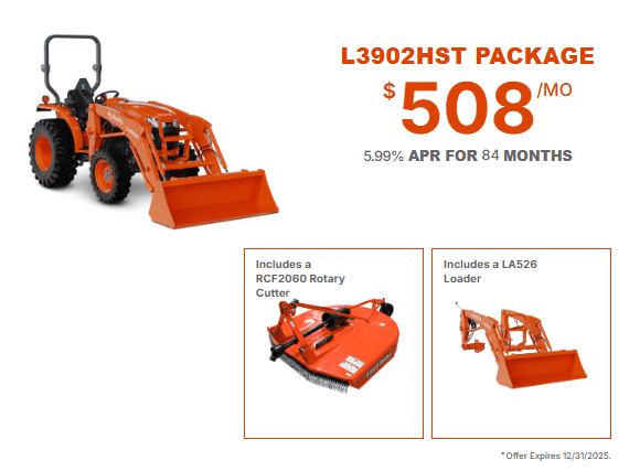 DISCLAIMER – $0 Down, 5.99 % A.P.R. financing for up to 84 months on purchases of new Kubota Standard L Series equipment from participating dealers’ in-stock inventory is available to qualified purchasers through Kubota Credit Corporation, U.S.A.; subject to credit approval. Example: 84 monthly payments of $14.60 per $1,000 financed. Customer instant rebate of up to $3,500 with cash or standard rate financing on Kubota Standard L Series Equipment. Customer Instant Rebate is not available with 0% A.P.R. or other promotional financing. Offers expire 12/31/25. Terms subject to change. Taxes and insurance are not included. For complete warranty, disclaimer, safety, incentive offer and product information, consult your Dealer or KubotaUSA.com.