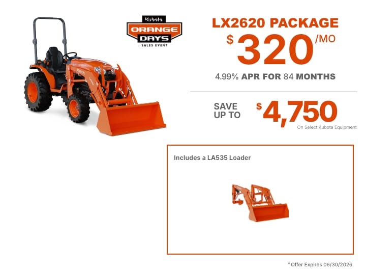 Monthly payment shown is based on no money down with 4.99% APR for 84 months. Insurance is included in the estimate; however, taxes and applicable fees are not included and may vary based on individual circumstances. Financing is subject to approved credit. Offer valid on in-stock units only. Promotion expires 2/28/2026, but is subject to change without notice. For complete details, visit your local dealer or KubotaUSA.